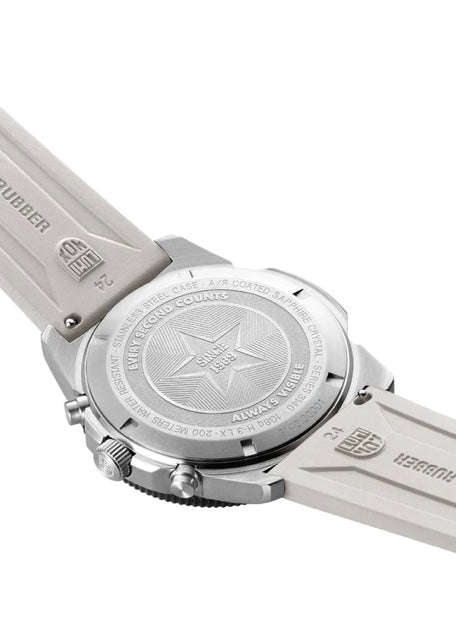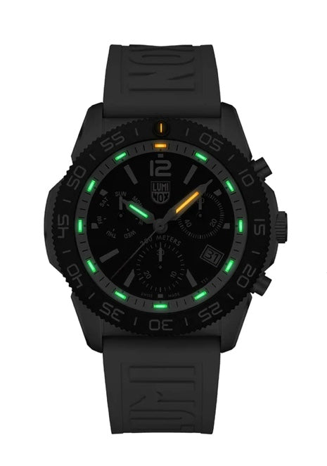 The Pacific Diver Chronograph boasts a 44mm stainless steel case with a CARBONOX™ unidirectional bezel, a vital instrument for any diver. A black dial features white numerals and indices for easy reading with a bright yellow dial ring. A matching yellow cut-to-fit rubber strap completes the look.